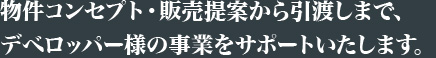 当社ではデベロッパー様からの委託を受けて不動産販売をしております。豊富な経験を活かし、土地の調査から周辺販売状況の分析、マーケティングリサーチ、売れる商品企画の提案、販売戦略、広告戦略、営業業務、契約締結、引渡までのサポートまでデベロッパー様の事業をあらゆる方面からサポートいたします。